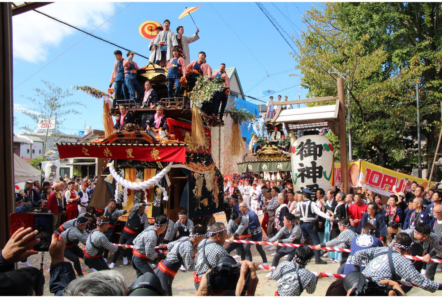 豊田都心の挙母神社の例大祭「挙母祭り」が先週末19・20日に開催された。初日のは雨のため、中心市街地でを運行する五町曳きは中止となったが、翌日の本楽は秋晴れ。多くの観客やカメラマンが集まるなか、上町三町と下町五町の山車八台が挙母神社へ曳き込まれた。先頭のは喜多町が務めた。