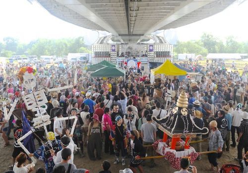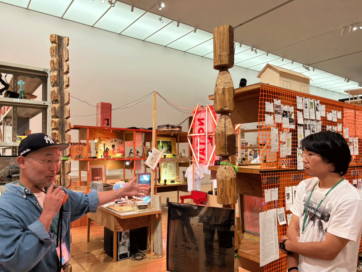 大阪市の木津川河口の北加賀屋のまちにある協働スタジオ「コーポ北加賀屋」による構造物作品の展示(写真)も目を引く。建築家集団やアーティスト集団、NPO法人など、様々な分野の人や組織が集まり、それぞれが独自に、ときには共同しながら制作やイベントなどを繰り広げているという。
