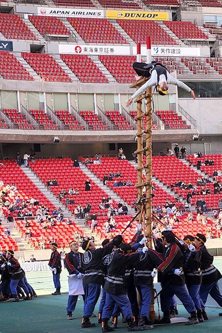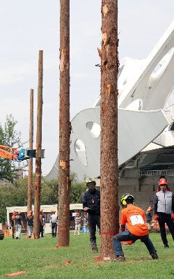 愛知県主催で第3回目となる「あいち伐木競技会」が14日、豊田大橋下の河川敷公園で大々的に開催された。豊田市内では初めての開催だ。河川敷に高さ11・5mの丸太が立ち並び、チェーンソーの高回転音が橋に反響して、迫力満点の競技会だった。
