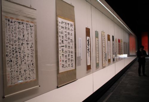 今回の記念展では楷書、行書、草書、かな、隷書(れいしょ)、刻字など多種多様な作品約200点が並ぶ。目玉は論古社で学ぶ人の多い中国漢時代の書の拓本展だ。観覧者にもその魅力を知ってもらおうと33点を展示し、なかには縦約230㎝×横約320㎝の大作もある。