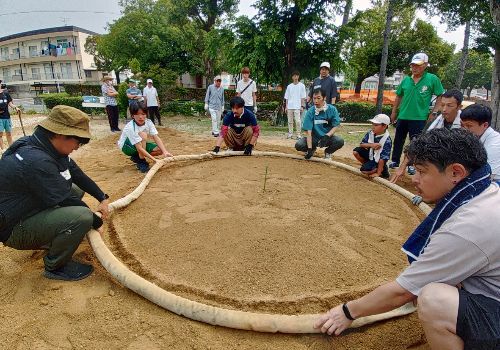 豊田市松平地区の豊松小学校運動場を会場にして先週末14日、新しい盆踊りイベント「月見祭」が初めて開催された。松平町に家族で移住してまだ3年目の矢野さん(45)が中心となり、市のわくわく事業補助金も活用して企画・準備してきたものだ。