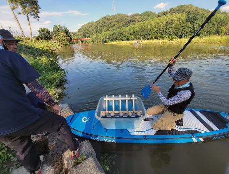 花火を打ち上げるのは矢作川の中州。枝下町遺跡調査隊のメンバーがサップで少しずつ運んだ。