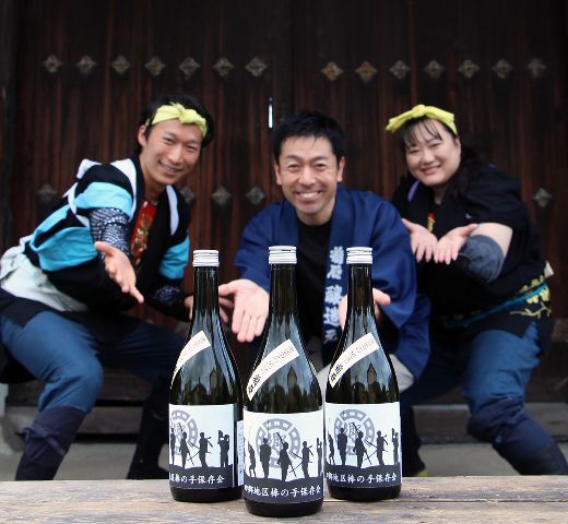 左から、四郷地区棒の手保存会広報委員長の福岡育大さん、浦野酒造杜氏の新井康裕さん、ラベルをデザインした脇田千帆さん。
