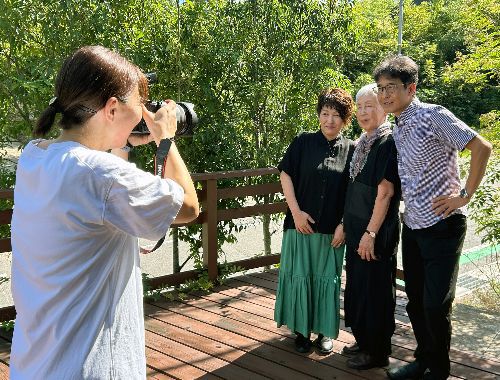 息子さん夫婦と参加した石黒静枝さん(81・岡崎市)は、写真用のスクリーンや庭を背景にまずは一人写真を撮影。続いて息子さん夫婦と寄り添って撮影していた。撮影中は松下さんの声掛けで笑いの多い和やかな雰囲気。石黒さんは「最初は緊張しましたが、すぐにノッてきちゃいました。プロのカメラマンに撮ってもらったことがないのでよい機会でした」と感想を話してくれた。
