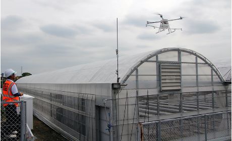 豊田市汐見町のいちご農家「ながた農園」が先月25日、10月から本格化するいちご栽培にむけて、ビニールハウス内の暑さを防ぐ遮光剤の散布をドローンで行った。豊田市内ではおそらく初めての事例だ。