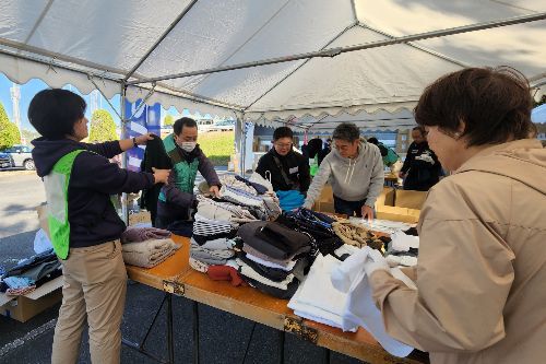 社会貢献活動がきっかけでつながった市内の諸団体や企業、大学、事前募集したボランティアにも共感の輪が広がり、事前のPRや回収、当日持ち込まれた衣料品の受け取り、仕分け、箱詰めなどに協力していた。