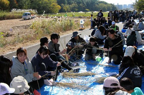 クリスマスリースづくりをするため、まずワラをなう学生や子どもたち。写真右奥に見える高層の建物群は三好ヶ丘駅周辺だ。