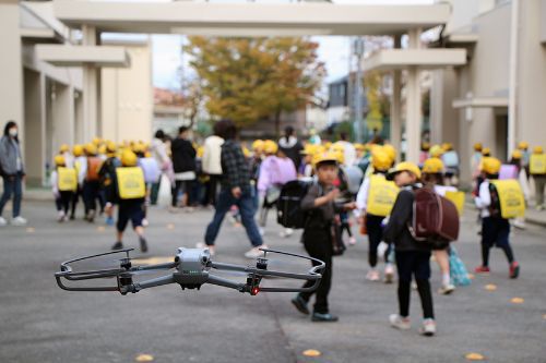 子どもたちが下校を始めるとドローンが離陸し、舞い上がって上空から見守った。
