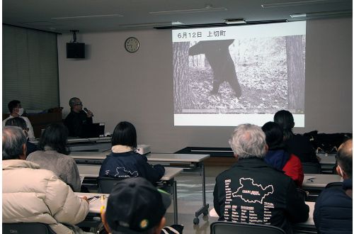講師を務めたのは2人。まず東加茂猟友会・旭支会のクマ担当者で、豊田市環境部の職員としても野生動物に詳しい弘中陽介さんが、センサーカメラによる生息調査の状況を報告。クマや他の野生動物が写っている動画を多用した見応えのある報告だった。